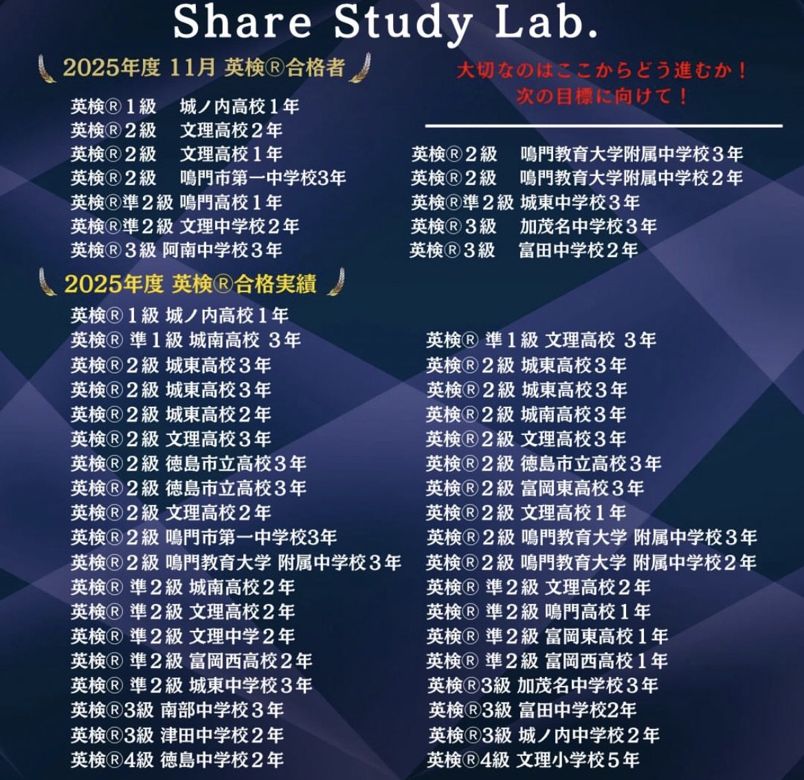 シェアスタディラボ(Share Study Lab.)は、徳島県の沖浜・阿南・住吉に教室を展開する、お子様のワクワク・ドキドキを大切に「心」と「思考力」と「学力」を育む学習塾です。